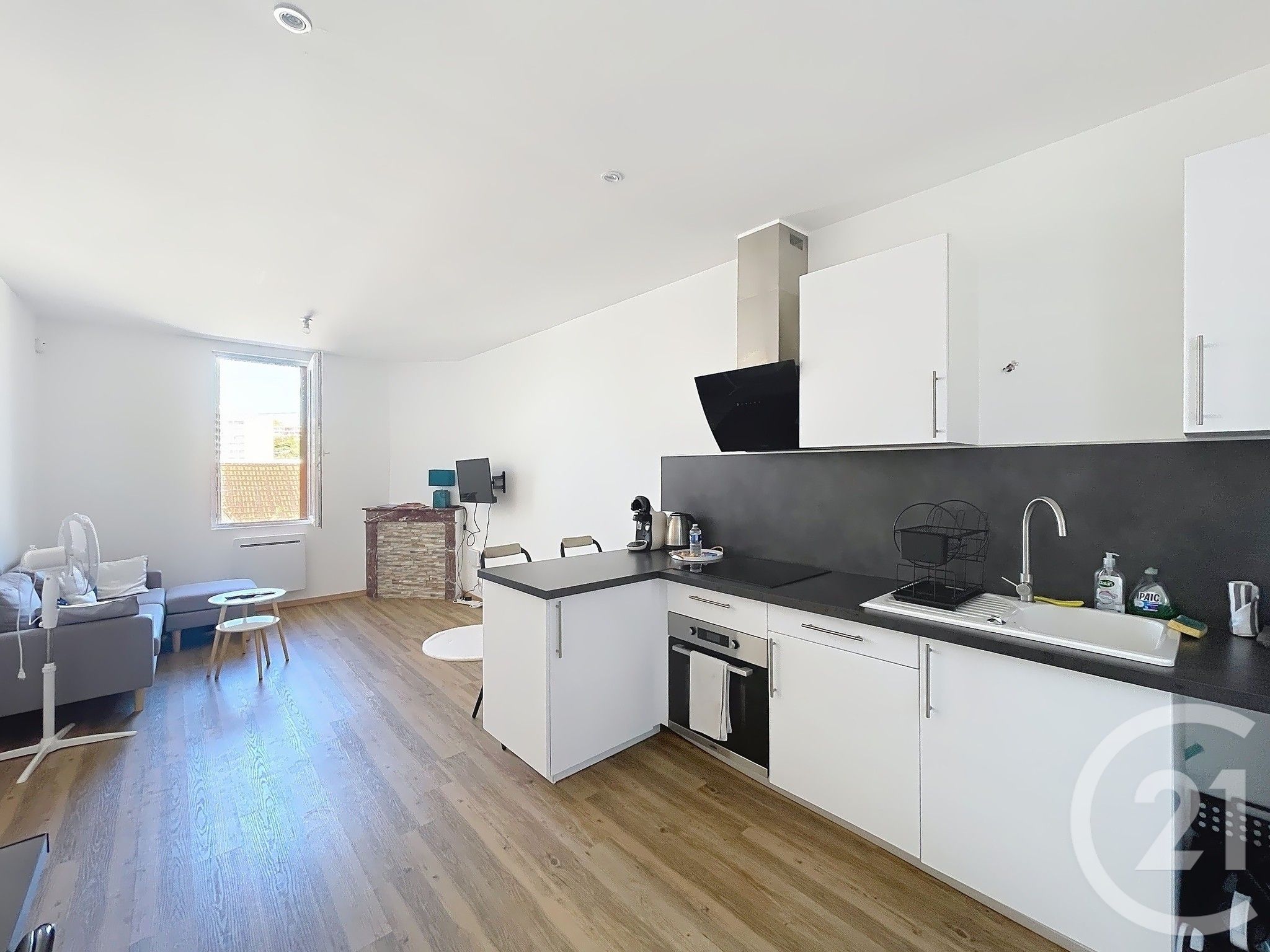 Une pièce de vie conviviale avec cuisine aménagée et équipée,